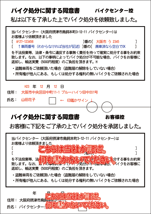 ・当日立ち会えない場合 1.ご連絡頂き、バイク原付引き取り場所、お引き取り日時等を決めます。 2.同意書をダウンロードして記述例に従って 車体番号 住所 氏名を記述、捺印。 3.同意書と鍵を当社指定の場所に置く(メットインの中など)。 お客様にして頂くことは以上です。 引き取りが完了しましたら同意書を完成させてお客様お控えを郵送致します。 ※ナンバープレート廃車を当社で行う場合、役所での廃車手続きを済ませた後 同意書のお客様控えと廃車書類をお送りします。 |